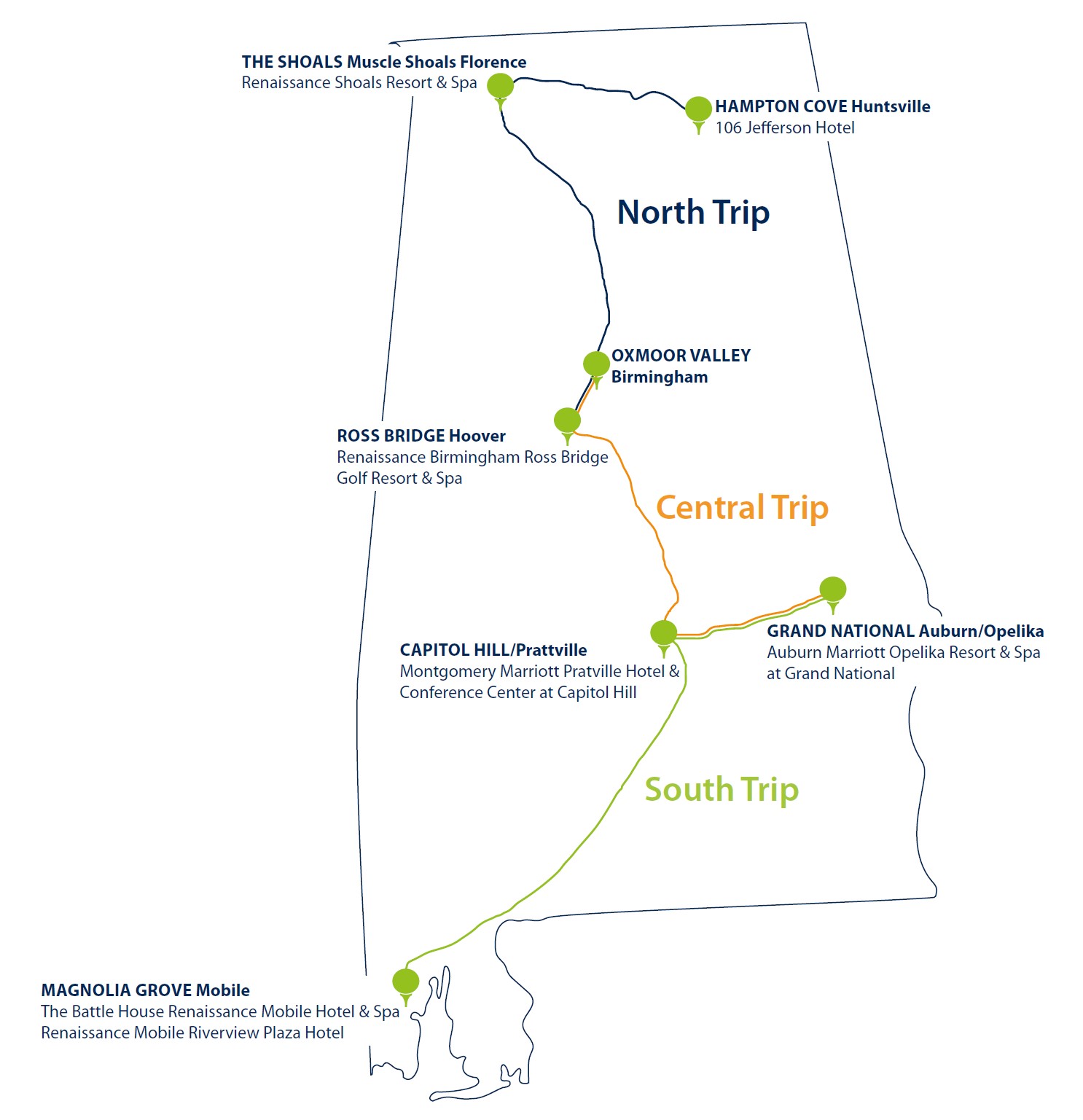 Der Robert Trent Jones Golf Trail, mit 25 Parcours und 450 Löchern, zählt weltweit zu den am besten ausgebauten Angeboten für Golfer. Seine elf Anlagen, sämtlich auf Meisterschaftsniveau, verteilen sich auf den ganzen Staat.
