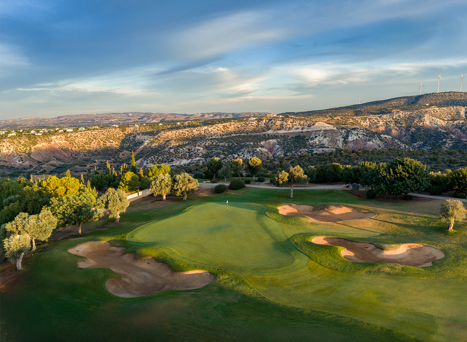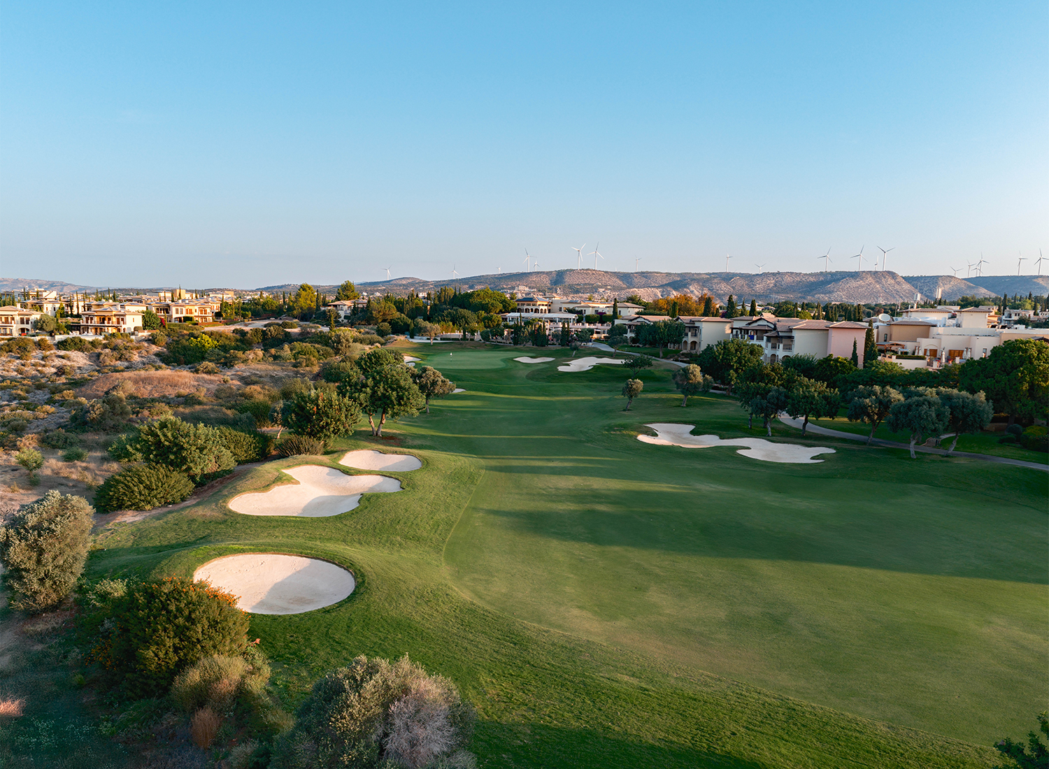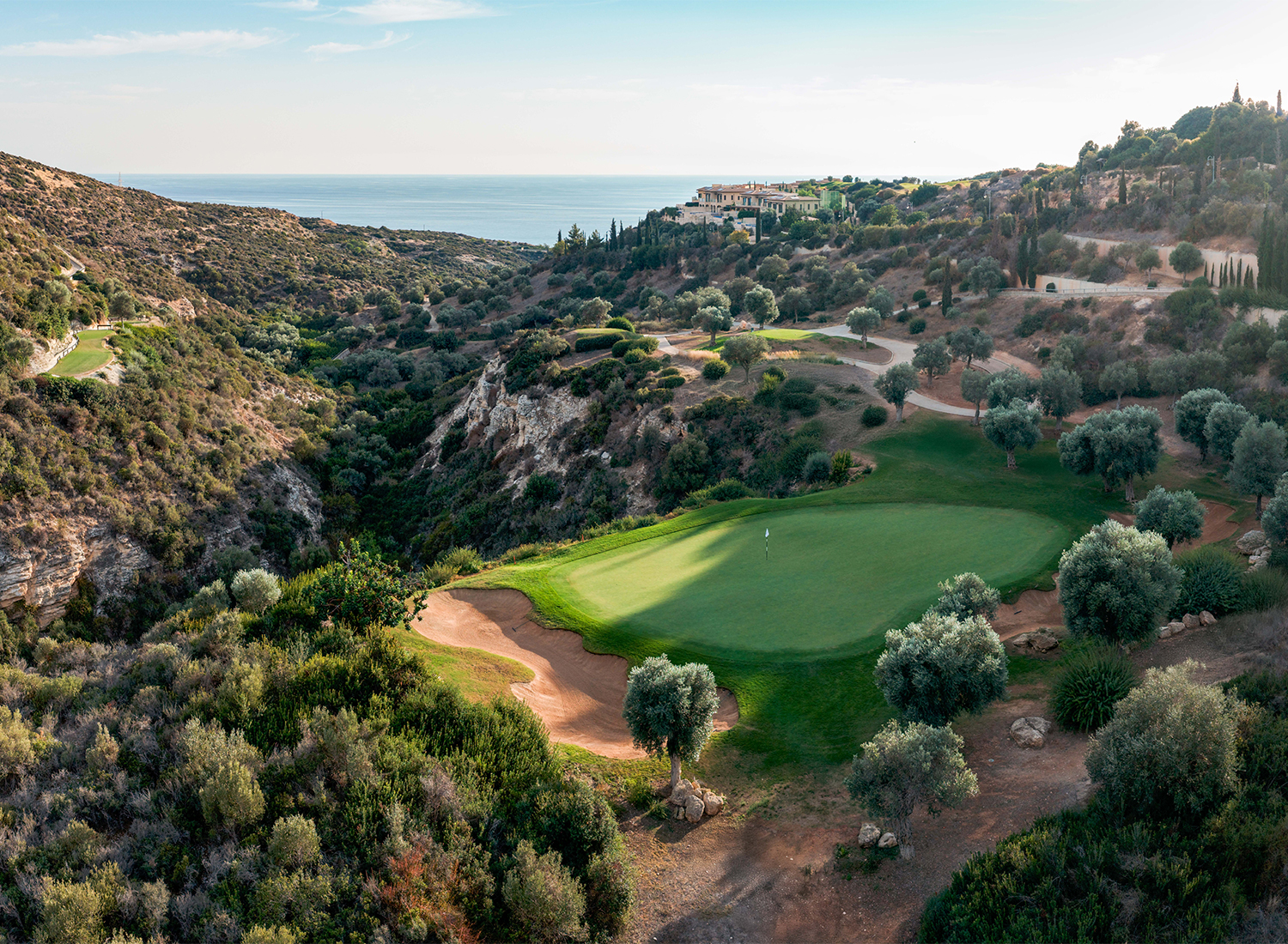 Der vor nicht allzu langer Zeit komplett modernisierte und mehrfach preisgekrönte PGA National Cyprus 18-Loch Platz beeindruckt mit seinen strategisch geformten Fairways und dem Ausblick auf das Mittelmeer. Optisch spektakulär erstreckt sich der Platz durch einheimische Oliven- und Johannisbrotbäume und ist auf zwei Plateaus gebaut, die durch eine dramatische Schlucht getrennt sind. Die atemberaubende 130 Meter lange Schlucht, die die Abschläge am 7. Loch trennt, ist eine verlockende Herausforderung für alle Liebhaber dieses schönen Spiels. In unmittelbarer Nähe befinden sich die 4 weiteren TOP Plätze – Elea GC, Secret Valley, Minthis GC und Limassol Greens.